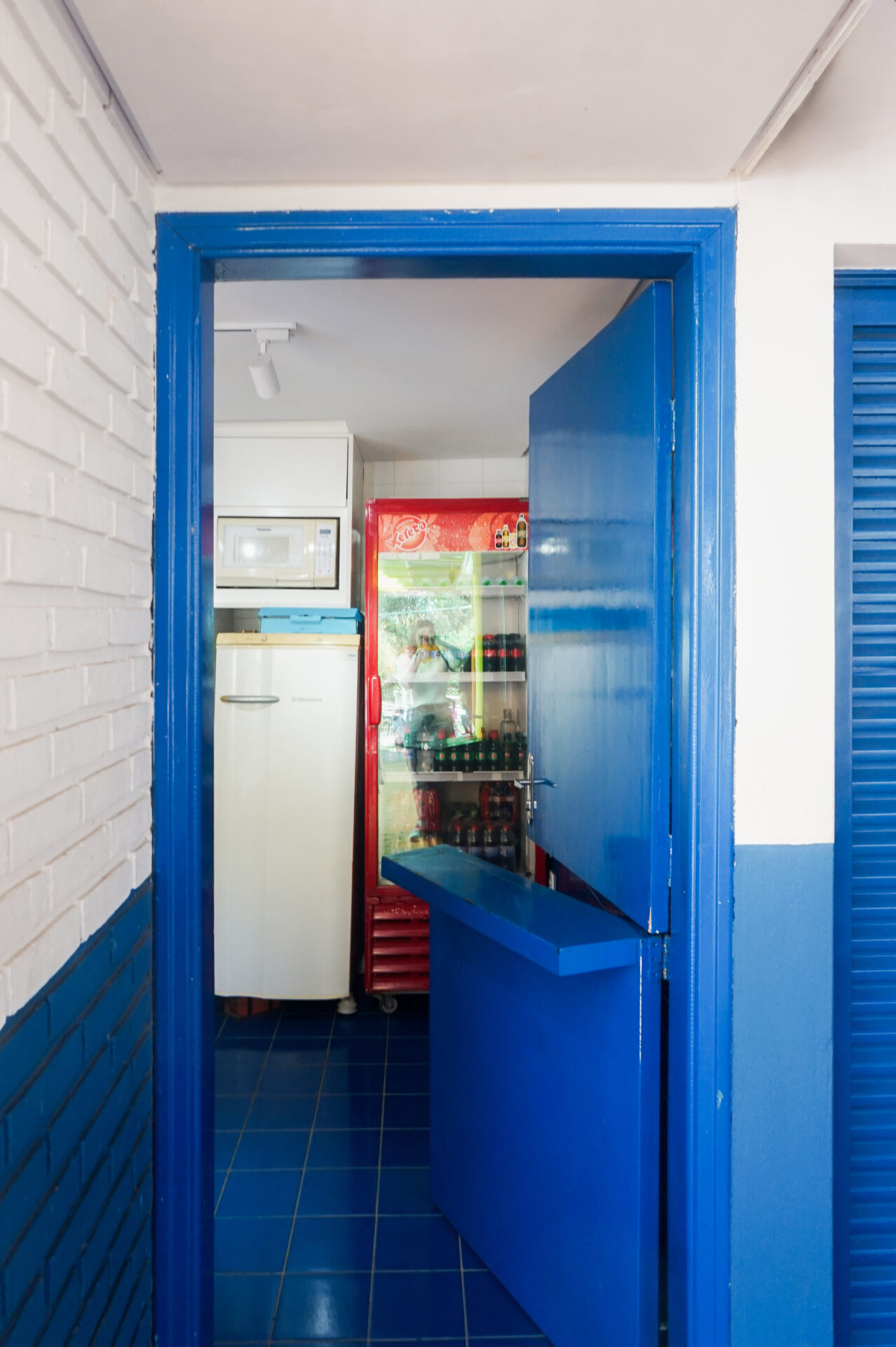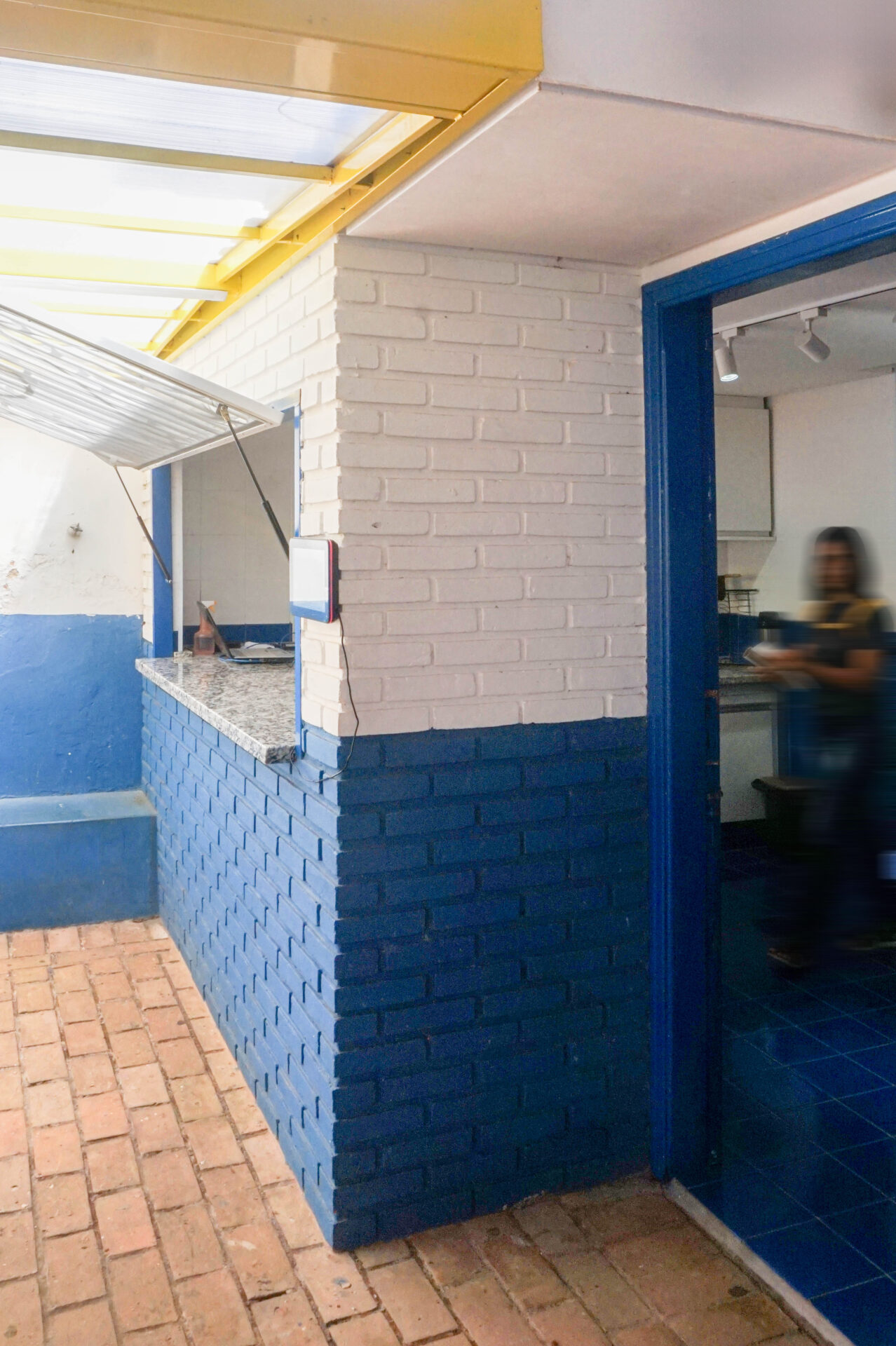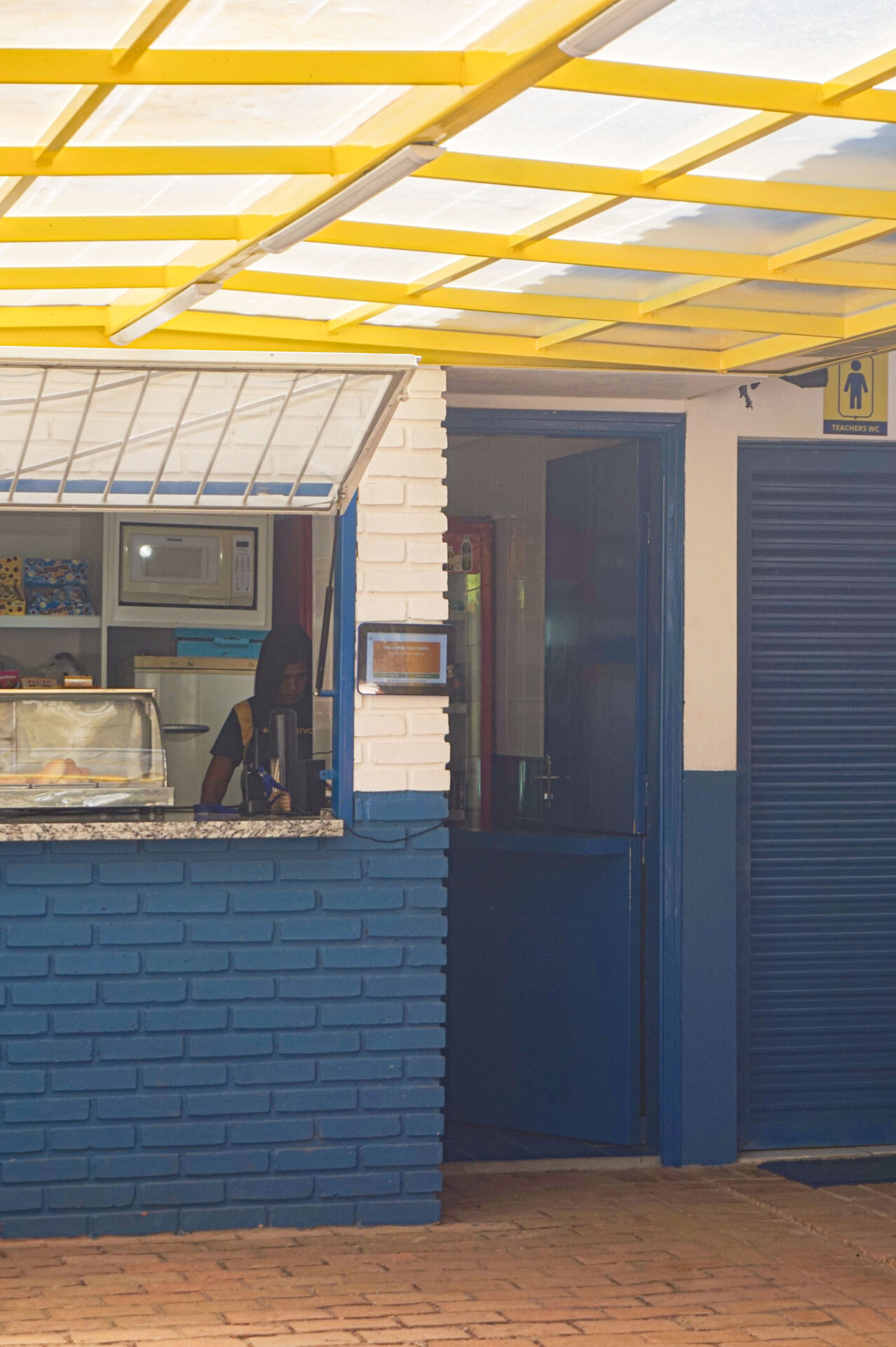 O entendimento da marca e a linguagem da escola foram essenciais para o início do projeto, além do estudo dos arredores e blocos presentes paralelamente à cantina, com a forte presença do tijolo aparente e das cores azul e amarelo. Portanto, foi realizado uma ampliação da área da cantina com a presença destas cores (azul e branco) em revestimentos e pinturas externas e internas, além da adição da cobertura para a fila da cantina em estrutura metálica leve em amarelo a fim de criar contraste e organizar os volumes da escola. Uma estrutura que encosta na cantina existente, um caráter de intervenção claro e intencional para o projeto.